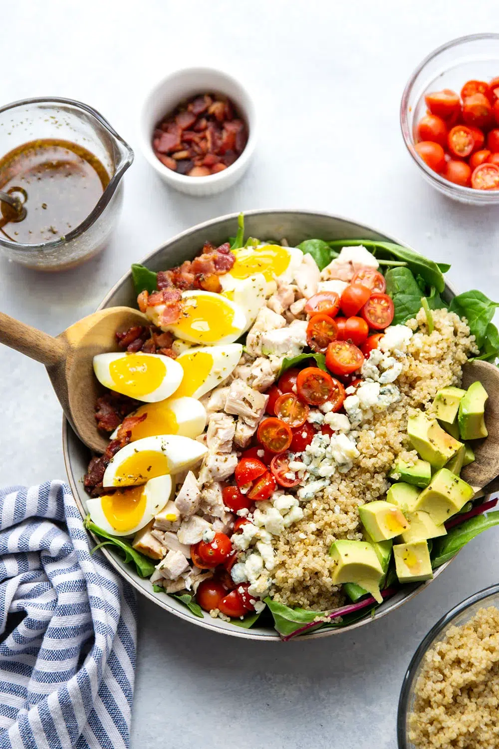 Fluffy quinoa adds the perfect boost of heartiness to this loaded chicken quinoa cobb salad! Pair it with a tangy homemade red wine vinaigrette for the perfect dinner or lunch salad.