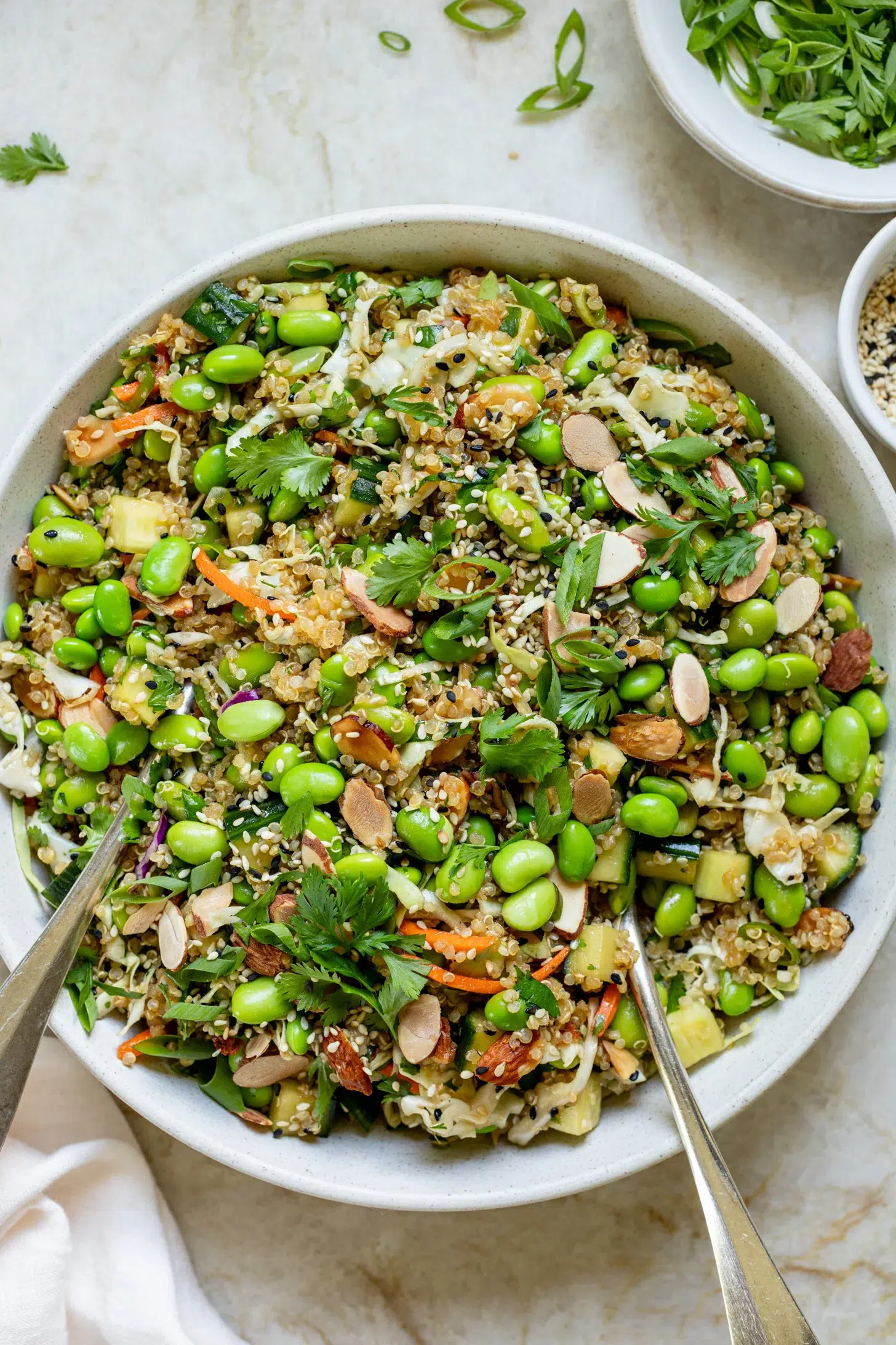 Grab a bag of frozen edamame, cook up some quinoa, whip up the Asian-inspired dressing, chop some cucumbers, toss in some bagged coleslaw mix + slivered almonds for that beautiful crunchโฆ.and letโs do this! Crunchyย edamame quinoa saladย is packed with veggies + is my current lunch obsession.