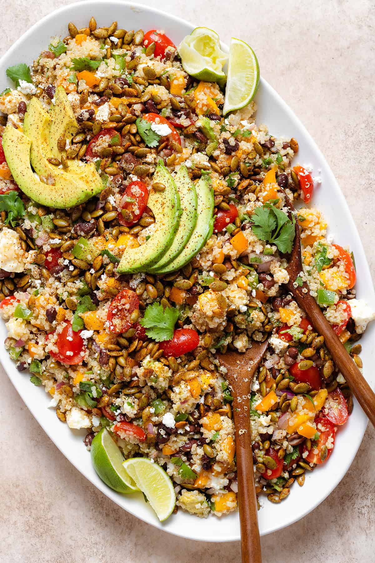 Thisย Mango Quinoa Salad with Chipotle Dressing and roasted pumpkin seedsย is the perfect mix of sweet, savory, and spicy. If youโve never tried mango in a salad, you have to give this one a try! It has no lettuce so itโs the perfect salad for meal prep!