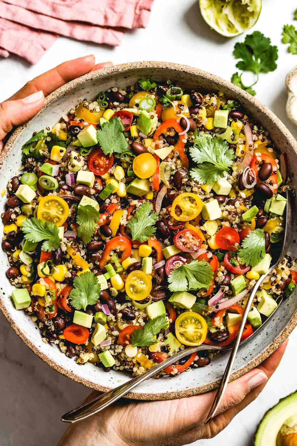 Thisย Southwest Quinoa Saladย with Chili Lime Dressing is a colorful and crunchy grain salad speckled with black beans, corn, avocado and cilantro that easily feeds a crowd. Itโs a filling salad bowl that can be made-ahead to enjoy for a light lunch throughout the week or served (warm or cold) as the perfect side dish at your next get-together.