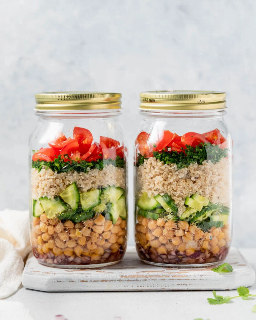 Incredible Cucumberย Chickpea Salad Jarย paired with a flavorful lemon vinaigrette! This easy-to-prep vegetarian lunch is filled with fresh veggies, chickpeas, quinoa, and herbs for a nutritious, protein-packed meal thatโs easy to grab and go.