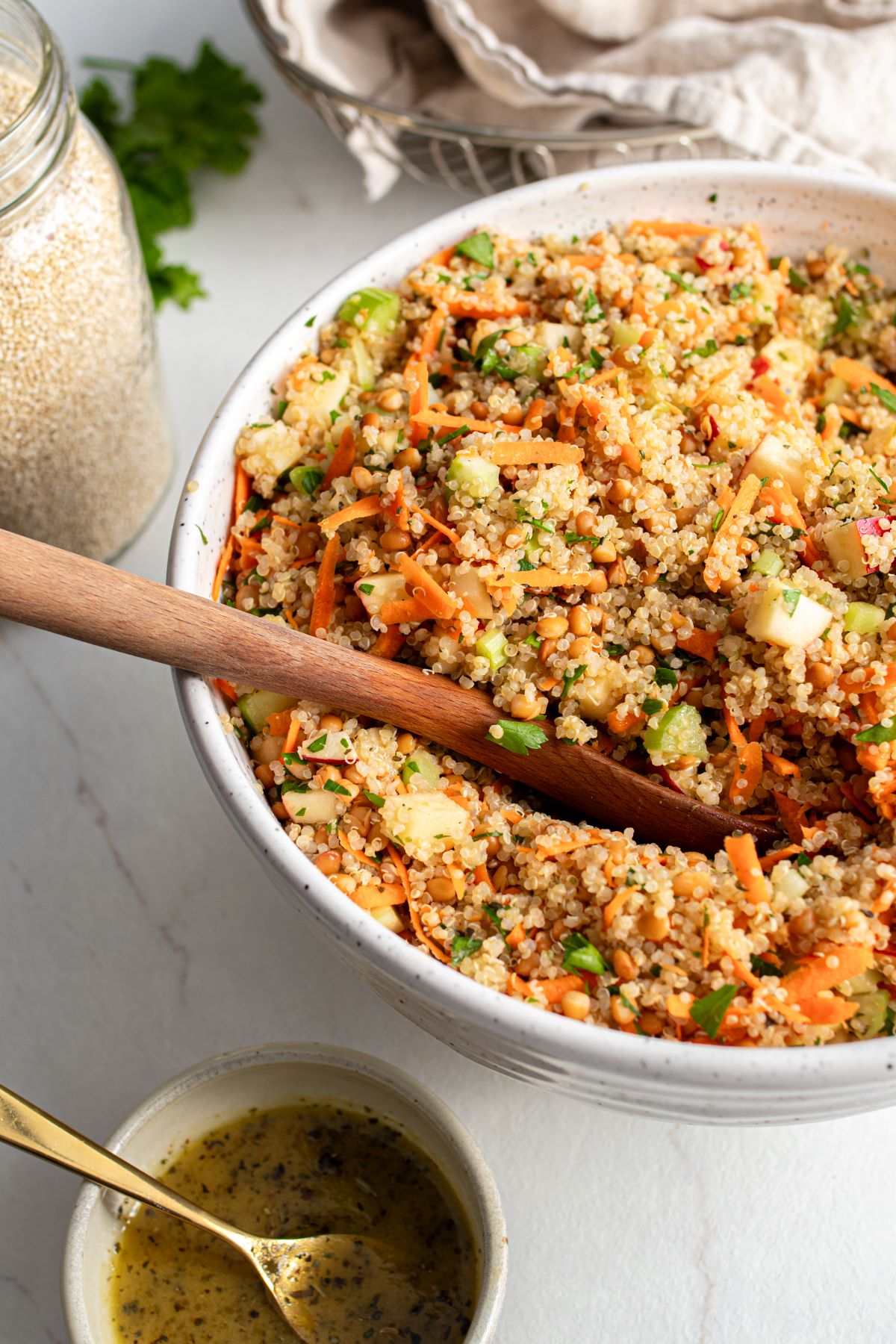 Thisย Quinoa Salad with Lentilsย recipe checks all the boxes. Lentils and quinoa satisfy while apples, carrots, and celery offer a delightful crunch. A bright vinaigrette dressing brings it all together. Itโs perfect for a light, energizing lunch. It also works as a side dish. Best of all, it stays fresh for days.