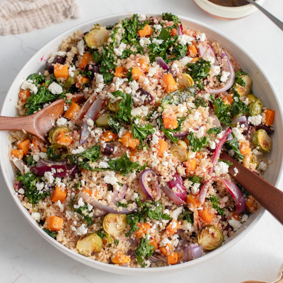 Thisย Roasted Vegetable Quinoa Saladย is packed with protein-rich quinoa, fiber-filled roasted Brussels sprouts, butternut squash, beets, and kale, all tossed in a flavorfulย Honey-Orange Balsamic Dressing. Itโs easy enough for a weeknight but elegant enough for your Thanksgiving table.