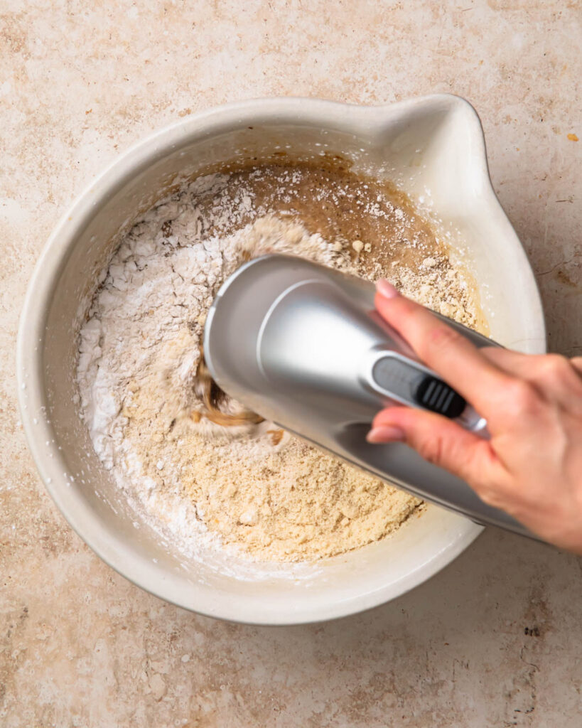 In a large mixing bowl whisk together the eggs, olive oil and coconut sugar. Add the almond flour and then seive in the buckwheat flour and tapioca flour. Add the date mixture and then use an electric mixer to mix until you have a smooth batter.